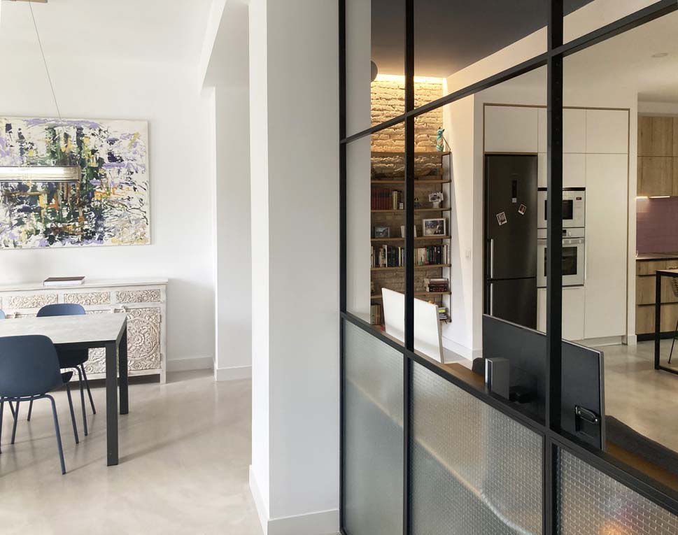 Se trata de una vivienda en bloque plurifamiliar de finales de los años 50, situada en el Ensanche de Valencia. La vivienda cuenta con una geometría algo caprichosa y achaflanada en su relación con el antiguo cauce del río Turia. En origen, la zona de día tiene una gran cantidad de luz, pero el resto de la vivienda se organiza con estancias recayentes a un largo corredor que consume una parte muy importante de la superficie y resta calidad espacial a la vivienda.