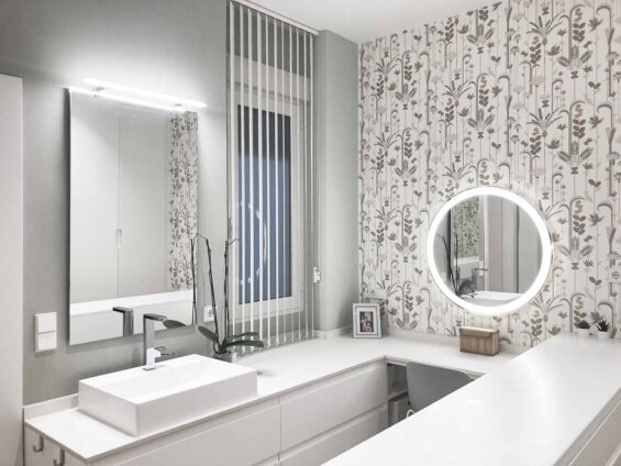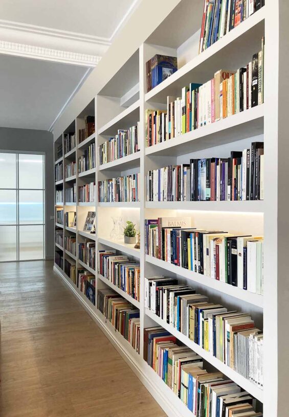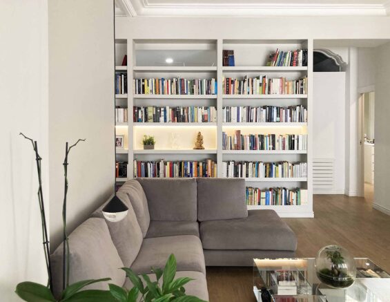 Estudiar la ampliación de la zona de día y obtener un dormitorio más, era una de las premisas de una gran familia de tres hijos. El proyecto entiende que es la pieza del dormitorio principal la que debe desplazarse a la zona ampliada, consiguiendo así un espacio que secuencia baño, vestidor y dormitorio, que vuelcan a la nueva terraza. La necesidad de almacenamiento de libros se nos plantea desde un principio, por ello la ejecución de una gran librería que recorre y unifica la zona de día, dotando al espacio de un fondo de perspectiva más cálido.