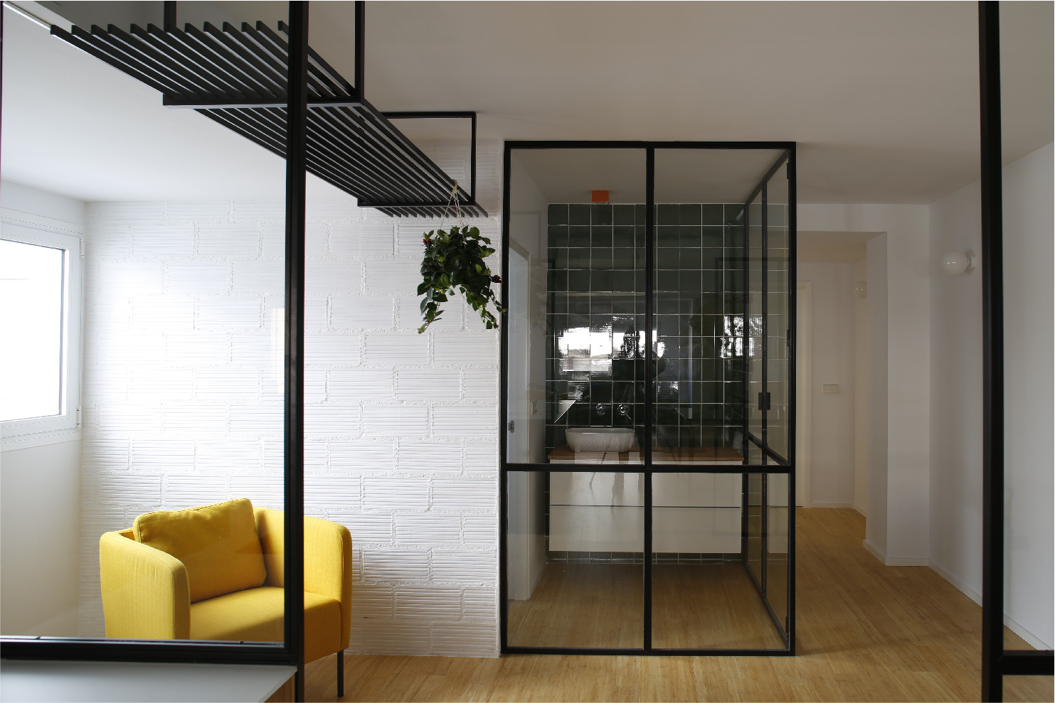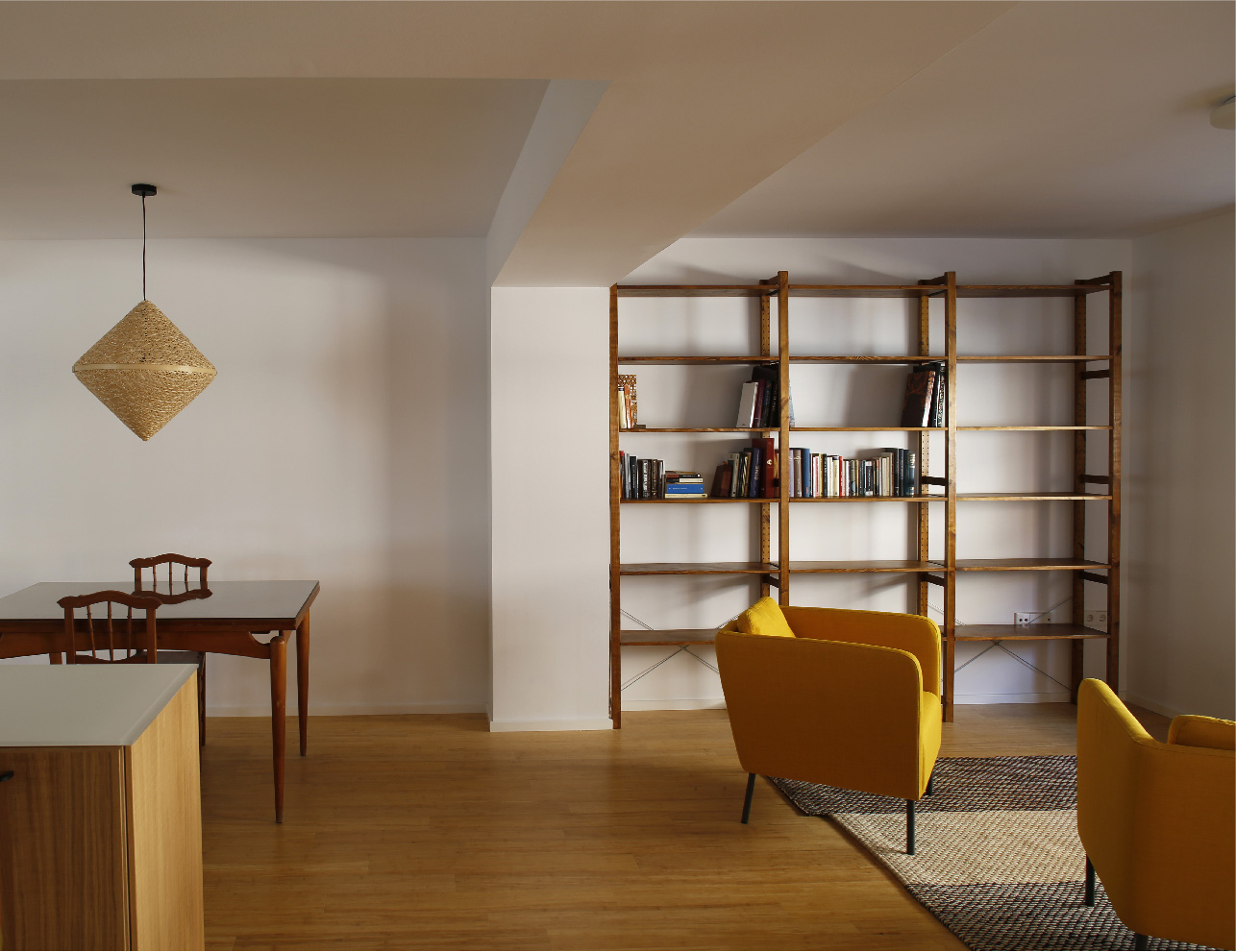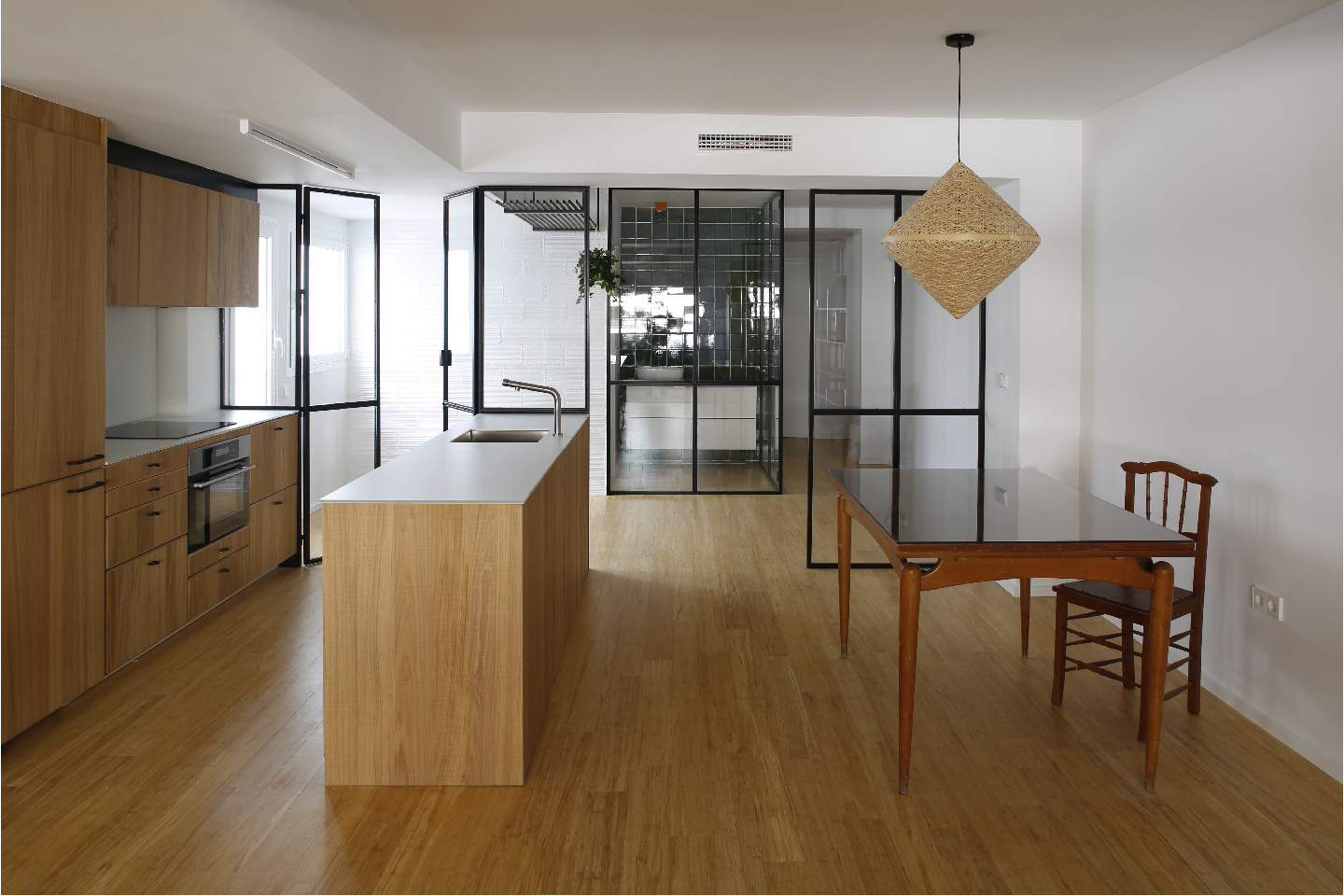 Era importante en esta vivienda eliminar la oscura y excesiva circulación original, al igual que generar un espacio de uso flexible que albergase el corazón de la casa. Es por ello que dicho espacio adquiere la atmósfera de patio interior, pues las estancias se abren a él como si de un patio se tratase. El muro a panderete pintado con cal, la cerámica vidriada del baño que asoma, las plantas y la luz que reflejan las fibras cálidas de bambú del pavimento, confieren a este nuevo “patio” de la vivienda, un lugar en el que todo cabe: los libros, las plantas, los discos, el cuarto de invitados, la vida al fin y al cabo.