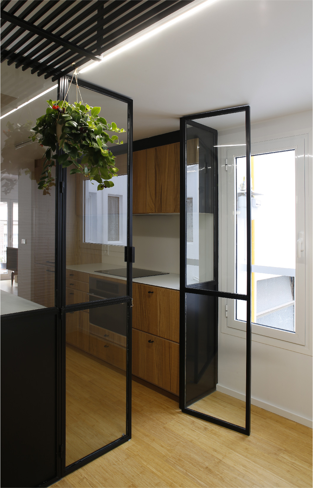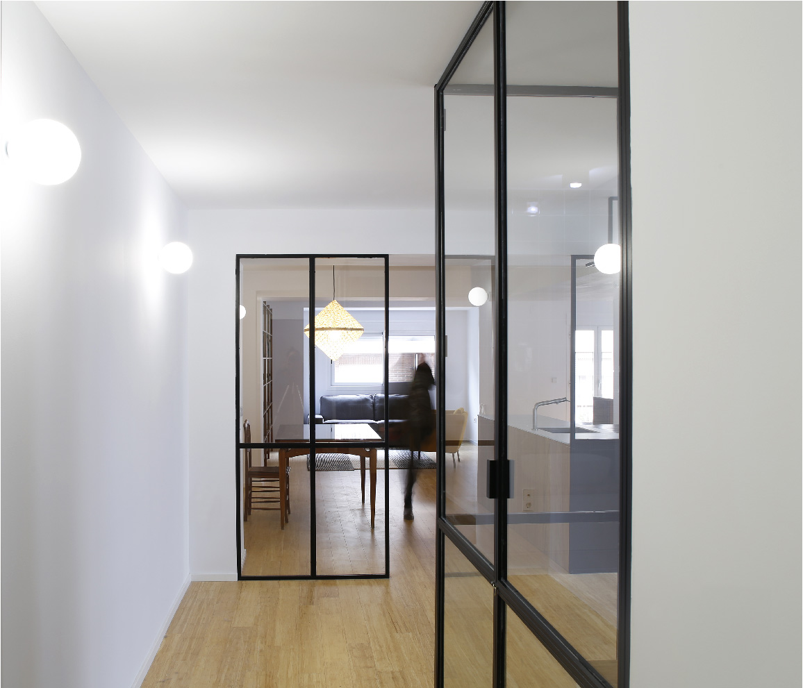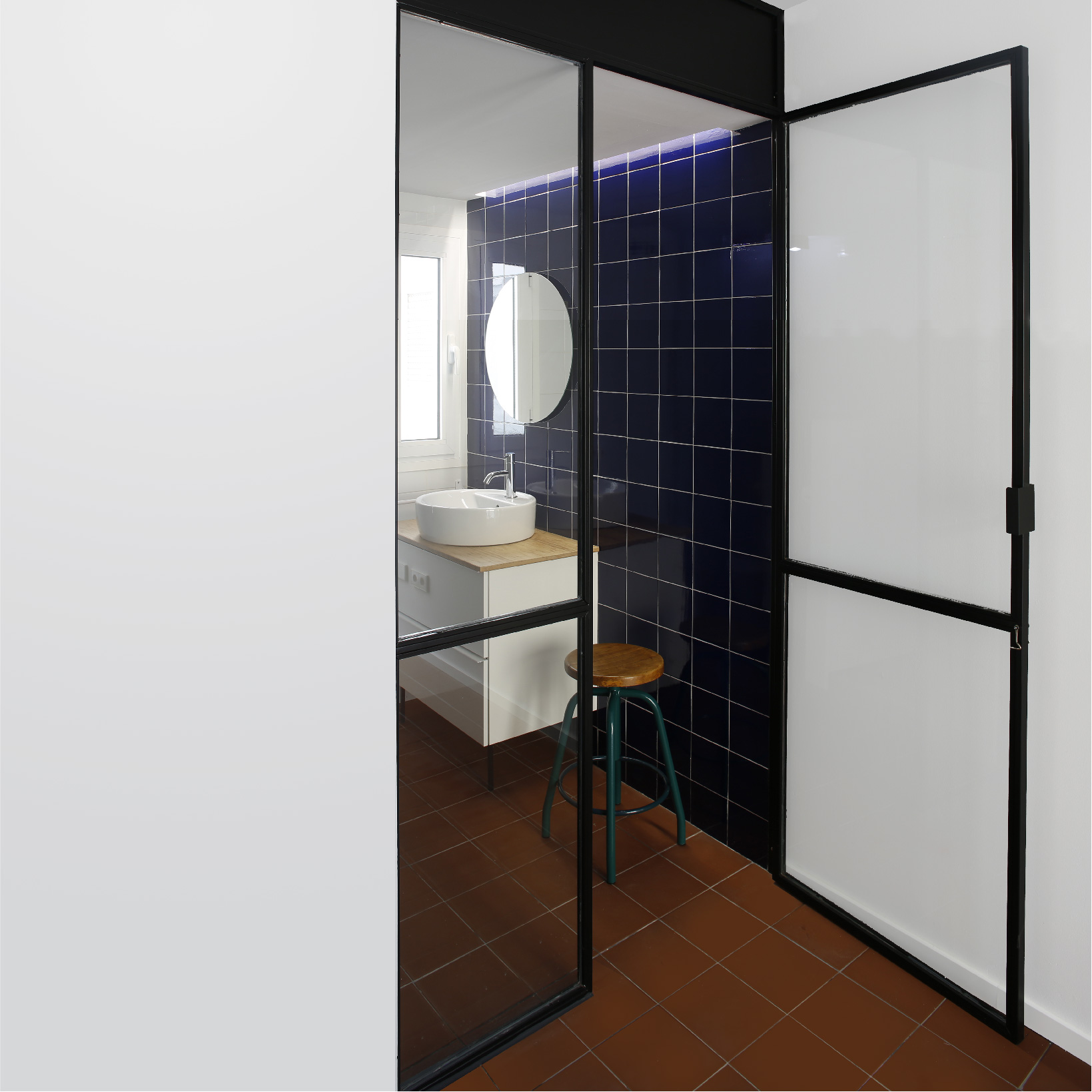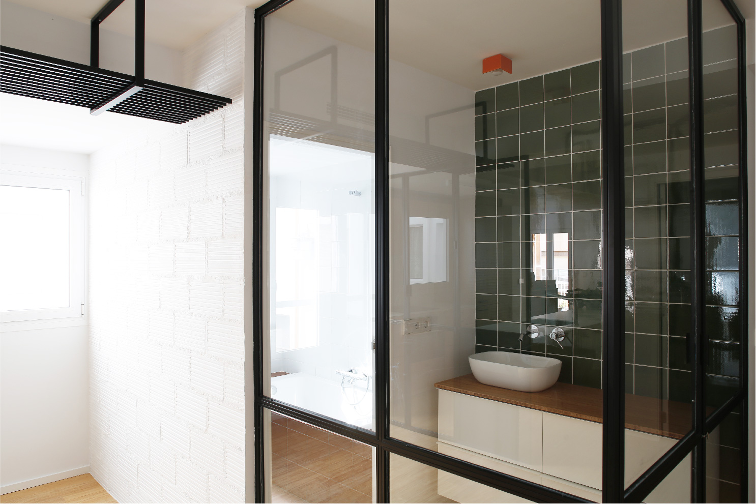 Era importante en esta vivienda eliminar la oscura y excesiva circulación original, al igual que generar un espacio de uso flexible que albergase el corazón de la casa. Es por ello que dicho espacio adquiere la atmósfera de patio interior, pues las estancias se abren a él como si de un patio se tratase. El muro a panderete pintado con cal, la cerámica vidriada del baño que asoma, las plantas y la luz que reflejan las fibras cálidas de bambú del pavimento, confieren a este nuevo “patio” de la vivienda, un lugar en el que todo cabe: los libros, las plantas, los discos, el cuarto de invitados, la vida al fin y al cabo.